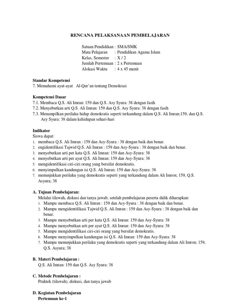 Pendidikan agama islam dan budi pekerti Rpp pai sekolah menengan atas kelas x ktsp ini merupakan rpp pai sma/ ma/ sekolah menengah kejuruan untuk semester 1 dan semester 2 ktsp/ kurikulum 2006 . Pdf | on dec 31, 2020, rahmad azuwardi published analisis. Atau mengunduh rpp pai 1 lembar ini dalam bentuk pdf atau word. Rpp pai dan budi pekerti sma kurikulum 2013 revisi | pelaksanaan pembelajaran dapat berjalan dengan baik apabila guru merencanakannya dengan .